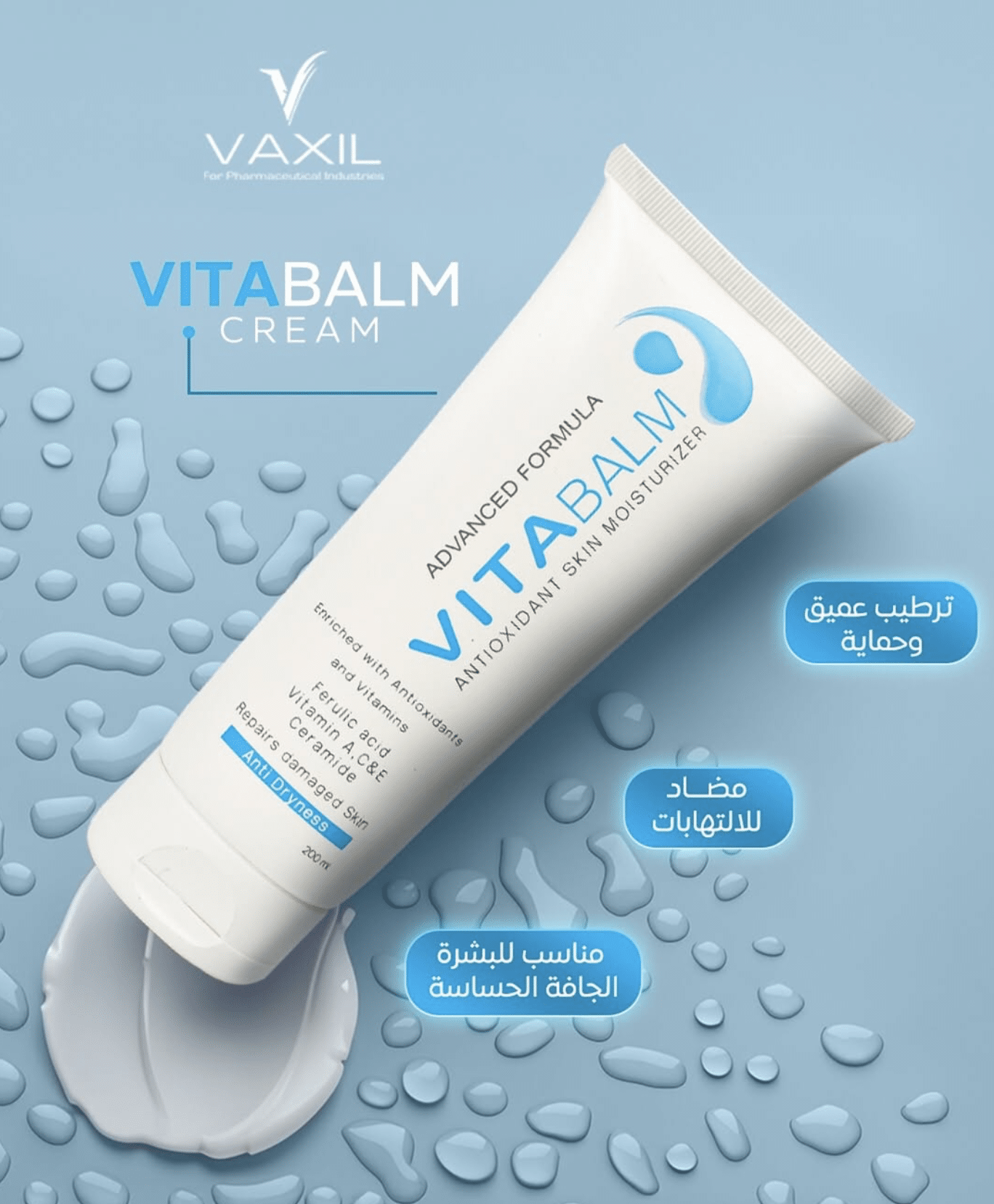 رطبي بشرتك واهتمي بيها زي ما تستاهل مع مرطب البشرة فيتابالم بمضادات الأكسدة من فاكسيل والفيتامينات. 💧 التركيبة المتطورة دي معموله بدقة علشان تديكي أقصى ترطيب، ترطيب عميق، وحماية قوية ضد العوامل البيئية اللي بنتعرضلها كل يوم. 🛡️